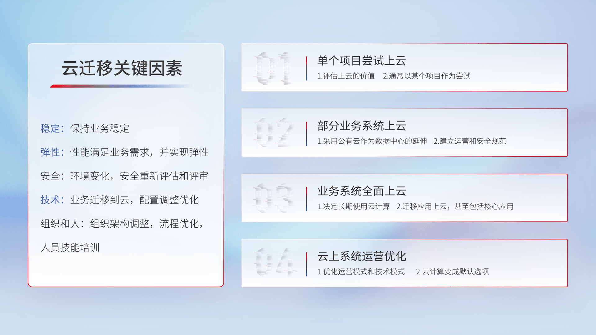 结合实际业务,,,,从规划设计、、、云平台选型、、云原生改造、、数据迁移、、、、集成交付,,迁移全过程为客户识别最佳上云路径,,,做好风险识别管理,,,,设计网络架构、、、身份权限、、、、安全审计合规、、、操作审计、、、、日志审计、、、监控告警策略、、、多站点容灾设计等,,,对云上基础设施进行整体规划,,提升IT治理水平,,以满足弹性、、、高可用、、、、高性能的需求。。。