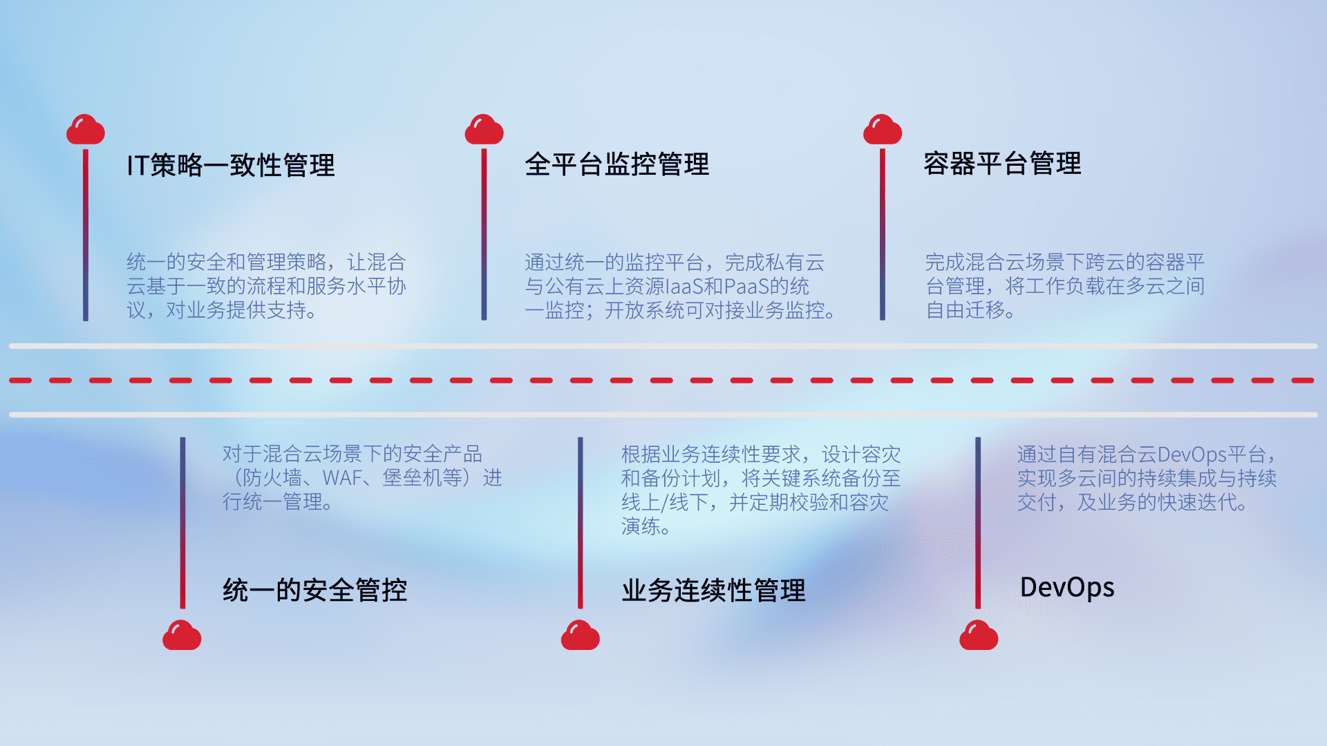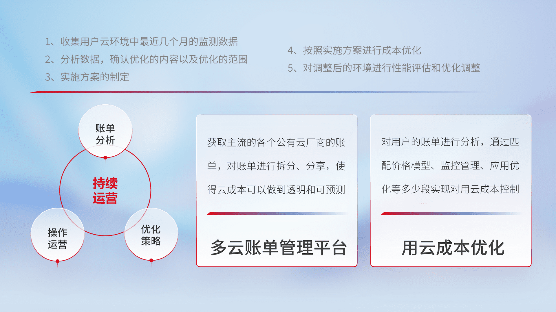 通过多云纳管,,,,以统一的资源数据模型把客户的云资源进行抽象和封装,,,,进而实现对多云资源的统一操作,,,保障云资源管理的可靠性、、、稳定性与可用性。。。。量身定制化运维内容,,配置、、、、开发运维、、补丁管理、、、备份、、、、监控、、认证和访问管理、、、审计和日常巡检等,,,,保障在用云过程中的可靠度,,,稳定度以及高可用率。。。